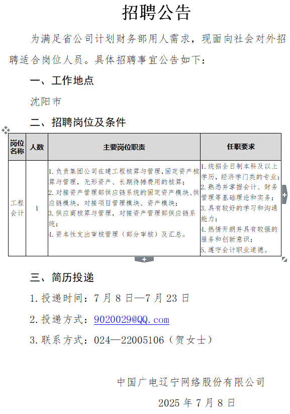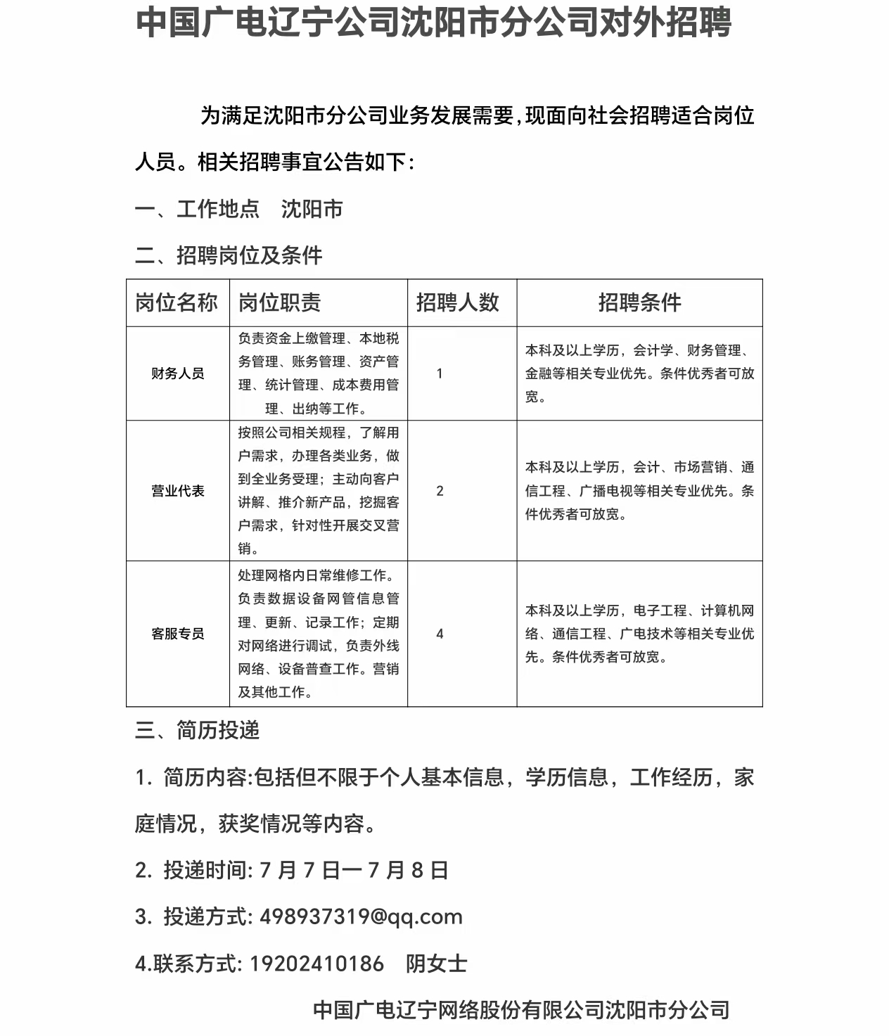 沈陽市分公司招聘公告
