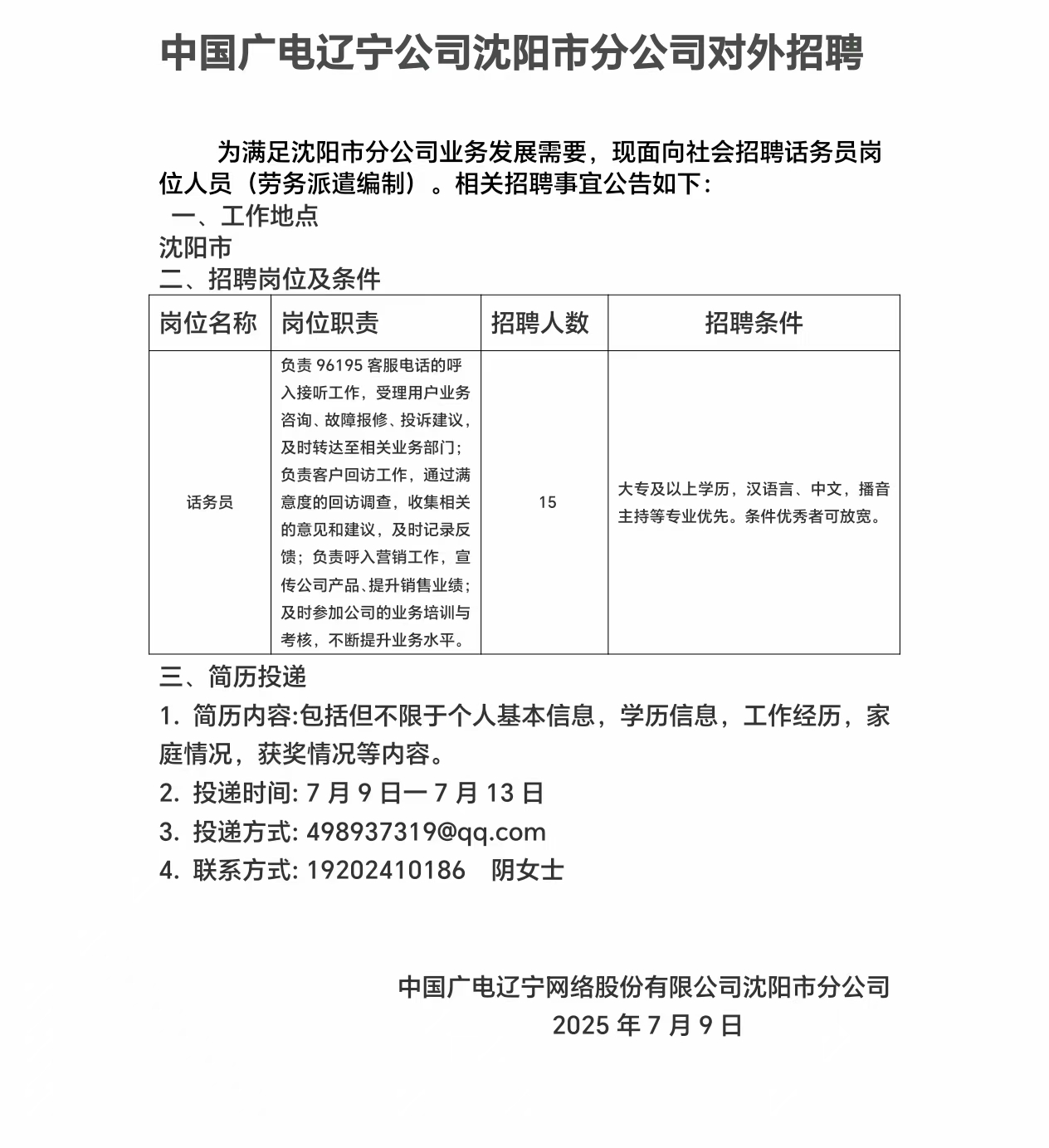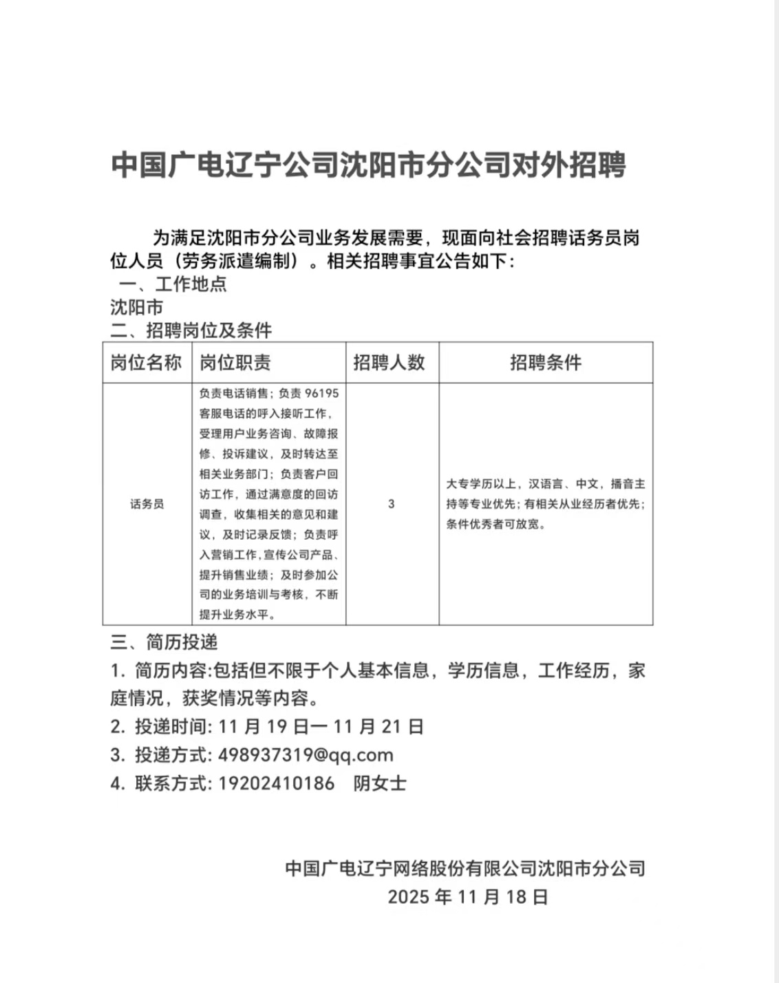 沈陽市分公司話務(wù)員崗位招聘公告