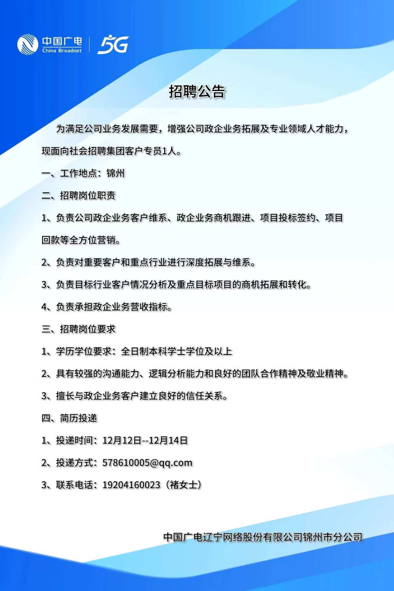 錦州市分公司招聘公告
