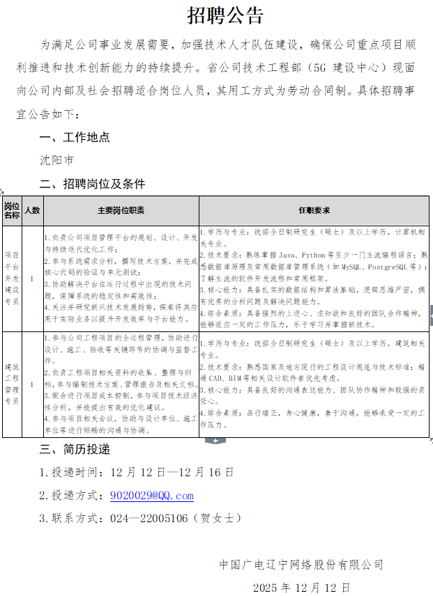省公司技術(shù)工程部(5G建設(shè)中心)招聘公告